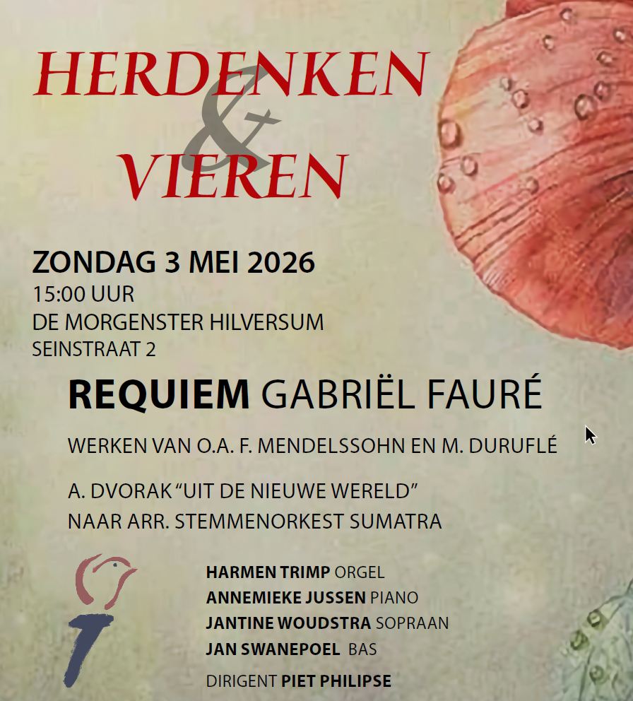 Herdenken & Vieren 3 mei ![]() 3 mei ‘Herdenken en vieren’, kenmerkend voor de eerste week in mei, is de titel van het concert dat op 3 mei a.s. in De Morgenster wordt uitgevoerd. Op het programma staat o.a. het Requiem van Fauré, het Largo uit Symphonie nr.9 uit de Nieuwe Wereld van Dvorak, naar een arrangement van het Stemmenorkest Sumatra en Peace I Leave With Youvan Mendelssohn. Het arrangement van het Stemmenorkest Sumatra heeft een bijzondere geschiedenis. Tijdens de Tweede Wereldoorlog zongen vrouwelijke gevangenen in een kamp op Sumatra deze melodie zonder woorden, wat hen troost en kracht gaf om de barre omstandigheden te doorstaan. Het muziekstuk werd zo een symbool van hoop en weerstand. In 2020 is er een arrangement van dit stuk gemaakt voor koren en ensembles, ter gelegenheid van 75 jaar bevrijding. De Morgenster, Seinstraat 2, Hilversum Aanvang: 15.00 uur Kaartverkoop”: www.concertkoornsf.nl en aan de zaal Toegangsprijs 22,50 inclusief consumptie en programmaboekje 13 t/m 18 jaar 10,00, kinderen gratis. | ||